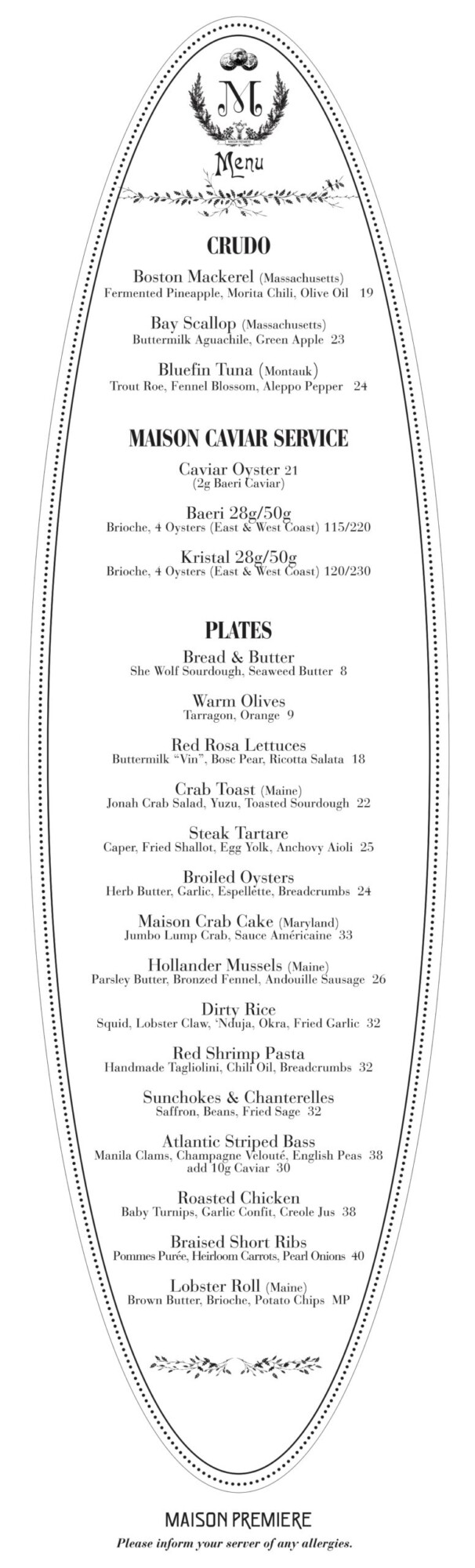 UPDATED Dinner MENU no desserts March 2026 | Maison Premiere